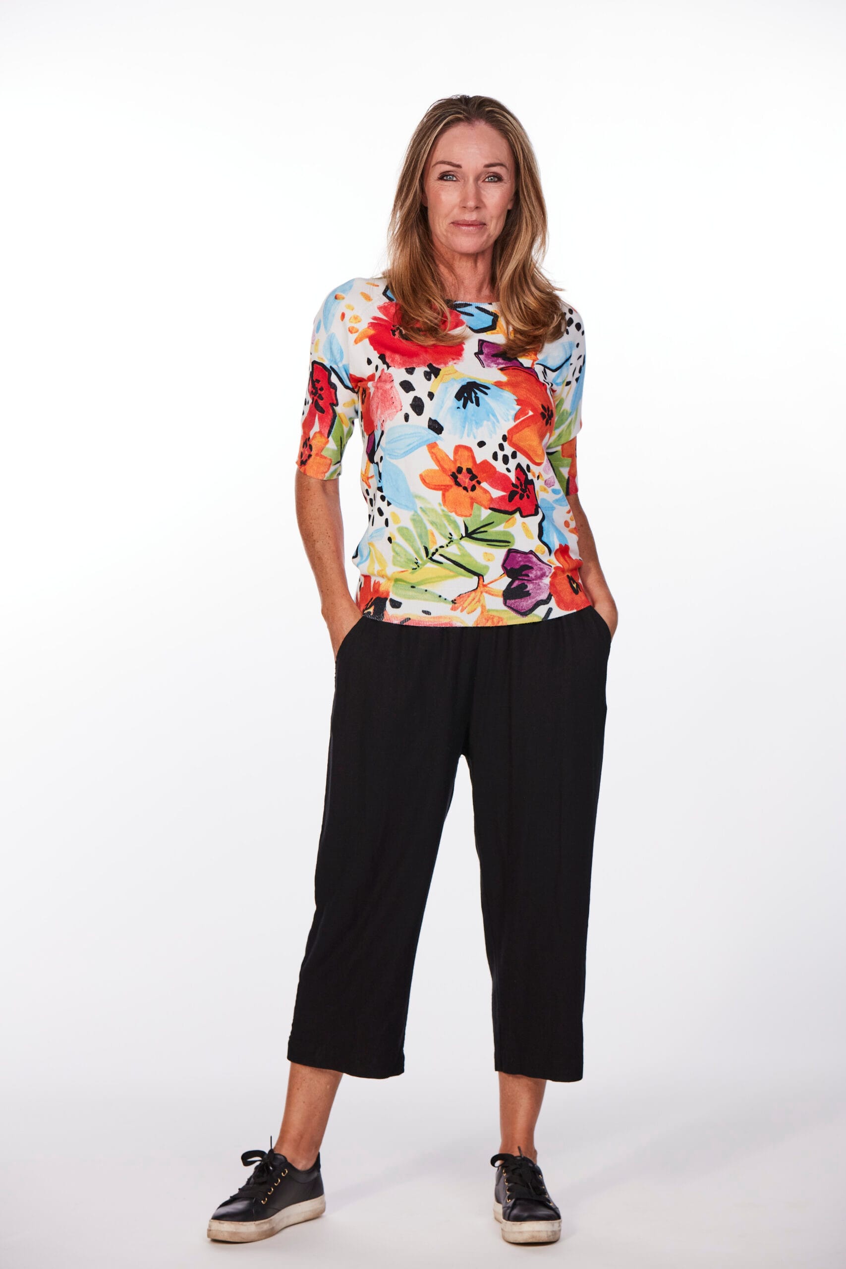 Kukkallinen neulepusero 3/4 hihalla