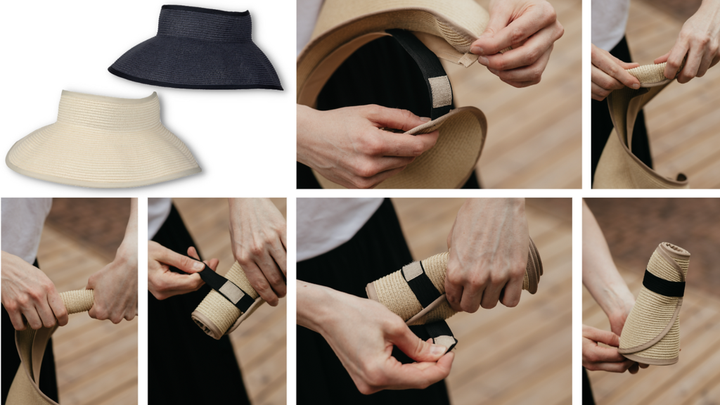 Kesään kätevä säädettävä ja taitettava UPF50+ suojalla varustettu visiirilippainen olkihattu, jonka voi pakata mukaan pienempäänkin tilaan! Katso alla, miten kätevästi hatun voi taittaa kokoon. Alla näet, miten tämän päähineen voi kääriä helposti kesäkassiin. KÄÄNTÖHATTU, KUKKAKUOSI JA YKSIVÄRINEN SININEN, 100% PUUVILLA, KOOT 56, 58 Katso kuvan hattu mallistossa